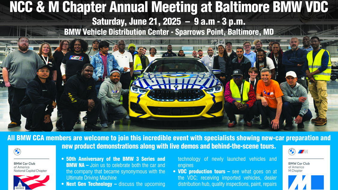 Welcome to the BMW Baltimore VDC for our NCC Annual Meeting! This exclusive event will take place on Saturday, June 21st from 9a-3p ET. All BMW CCA members from across the US are welcome to join this incredible event with BMW specialists showing new-car preparation, new product & technology demonstrations, live demos and behind-the-scene tours.