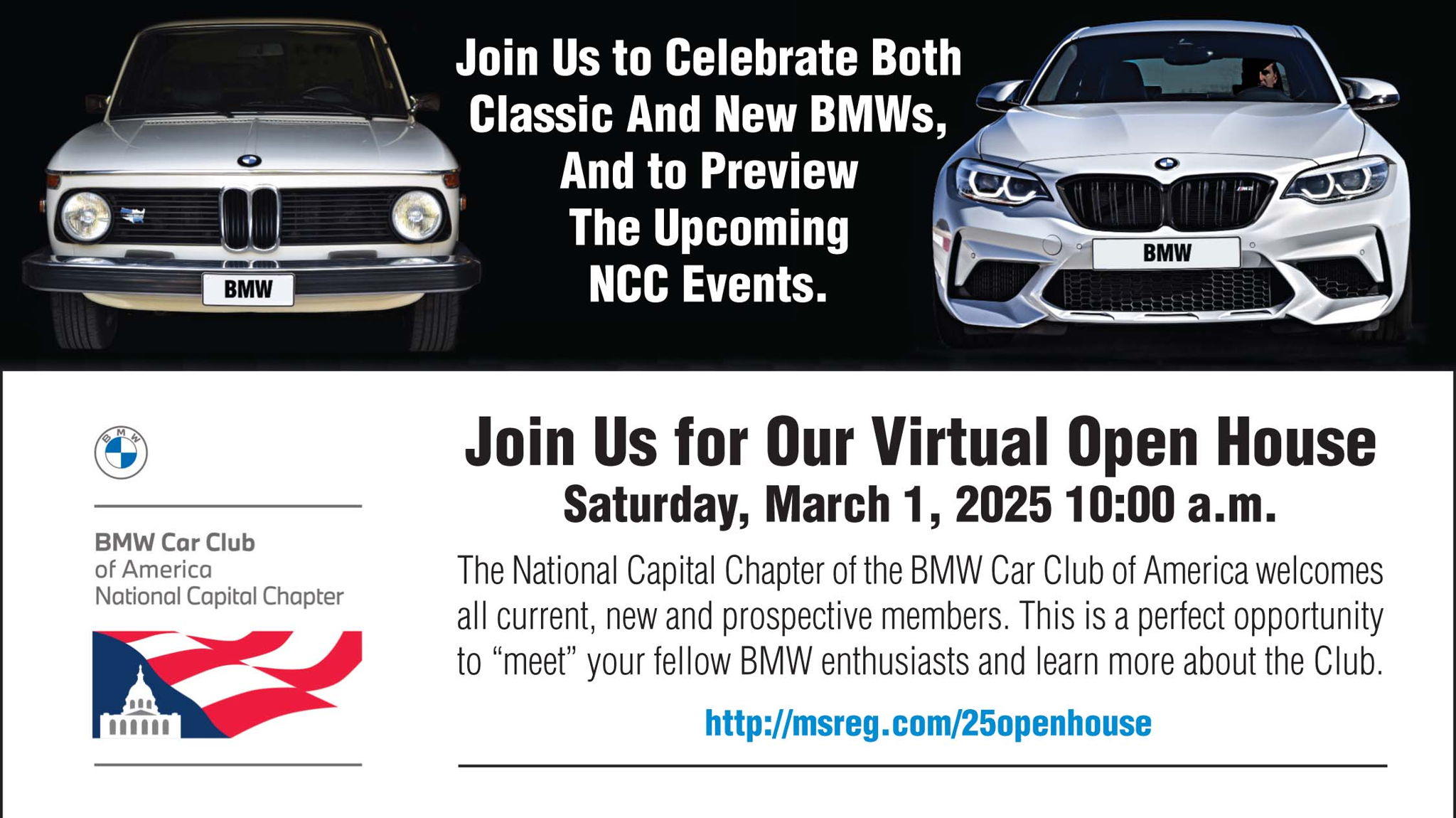 As we gear up for another big car season, we'll be hosting a virtual NCC Open House for all members to get a glimpse of the upcoming year. Whether you've joined in the past few months, have never come out to an event, or just trying to find out what we do, this meeting is specifically for you! We will have our program heads present, so this is the perfect opportunity to meet your fellow BMW enthusiasts, get your questions answered, and give you a taste of all the events you can participate in. We guarantee we have something for track rats, wrench turners, motorsport fans, and all BMW enthusiasts!